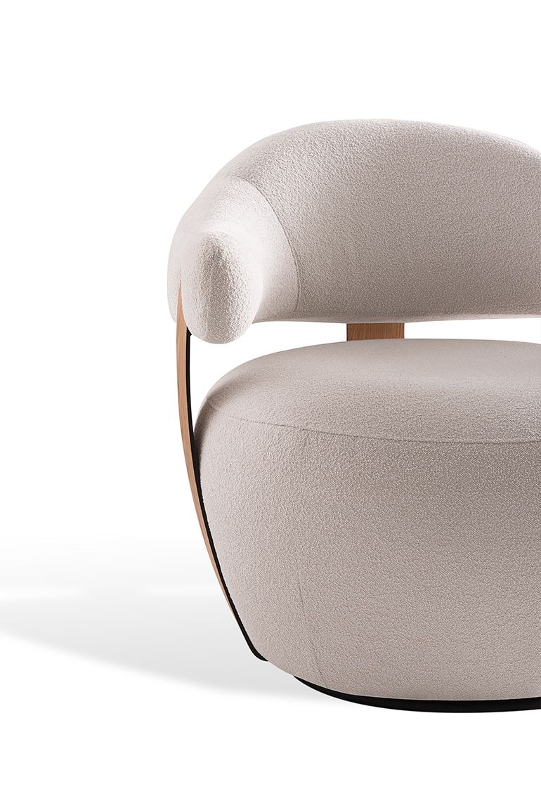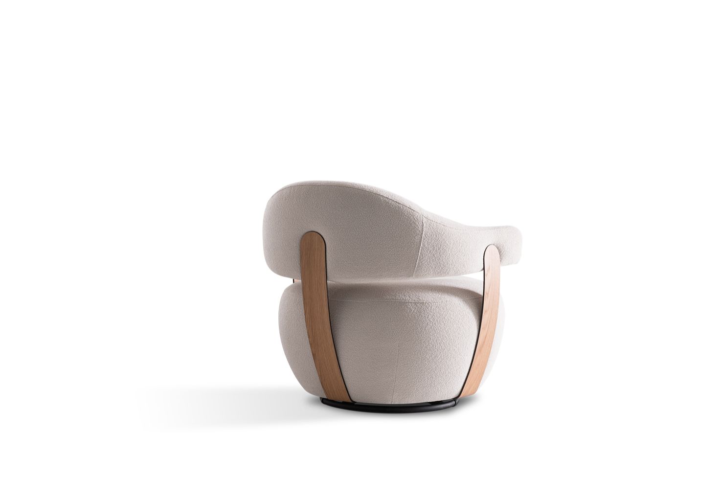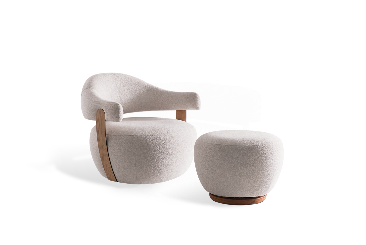 POLTRONA GIRATÓRIA OU FIXA COM BASE DE MADEIRA TAUARI. DETALHES LATERAIS: LAMINADOS, PINTADOS OU REVESTIDOS DE TECIDO. PUFF FIXO COM BASE DE MADEIRA TAUARI.